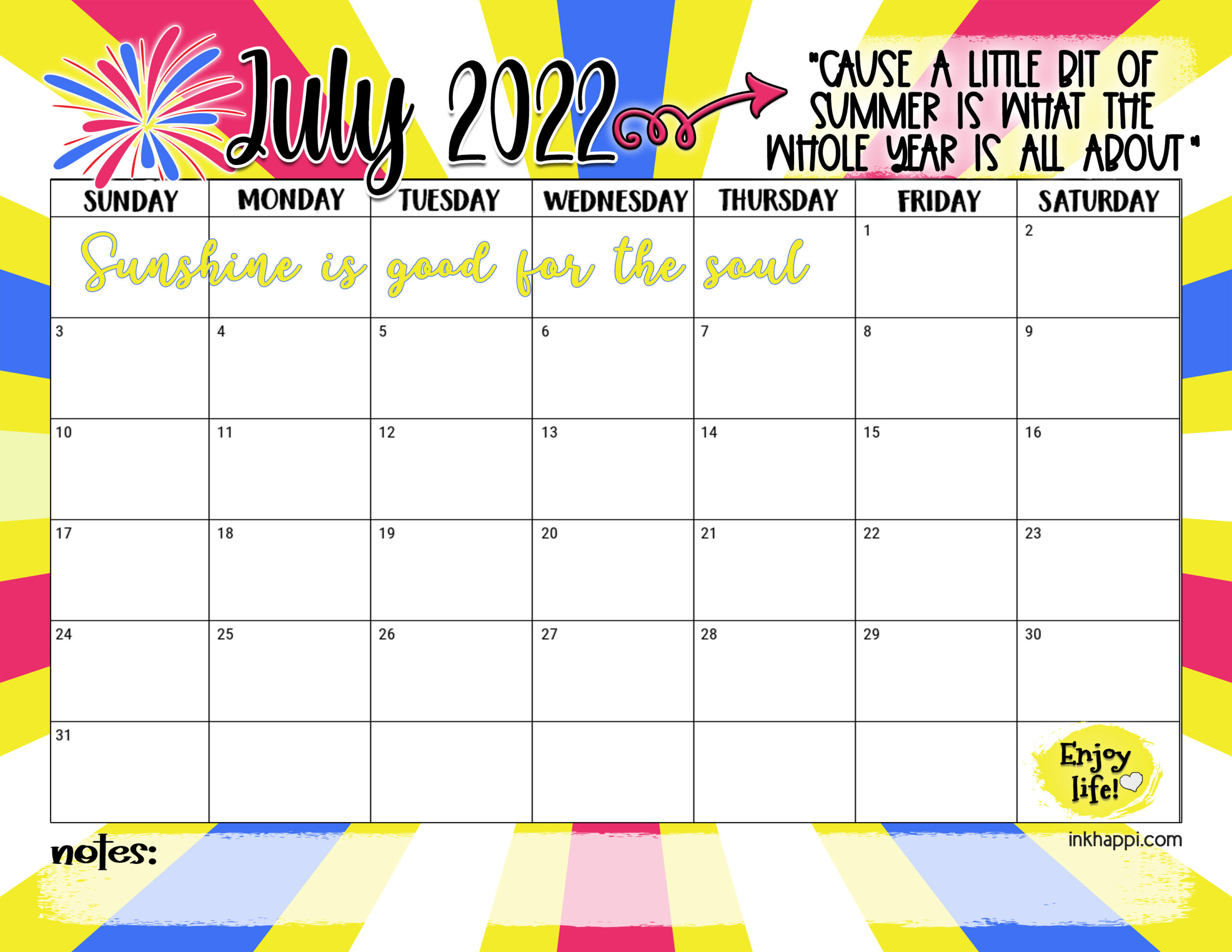 Summer is almost here and I’m sharing the July 2022 Calendar and some Summer thoughts. Summer always takes me back to my childhood where I was barefoot and carefree. This calendar is bright and reminds me of July.